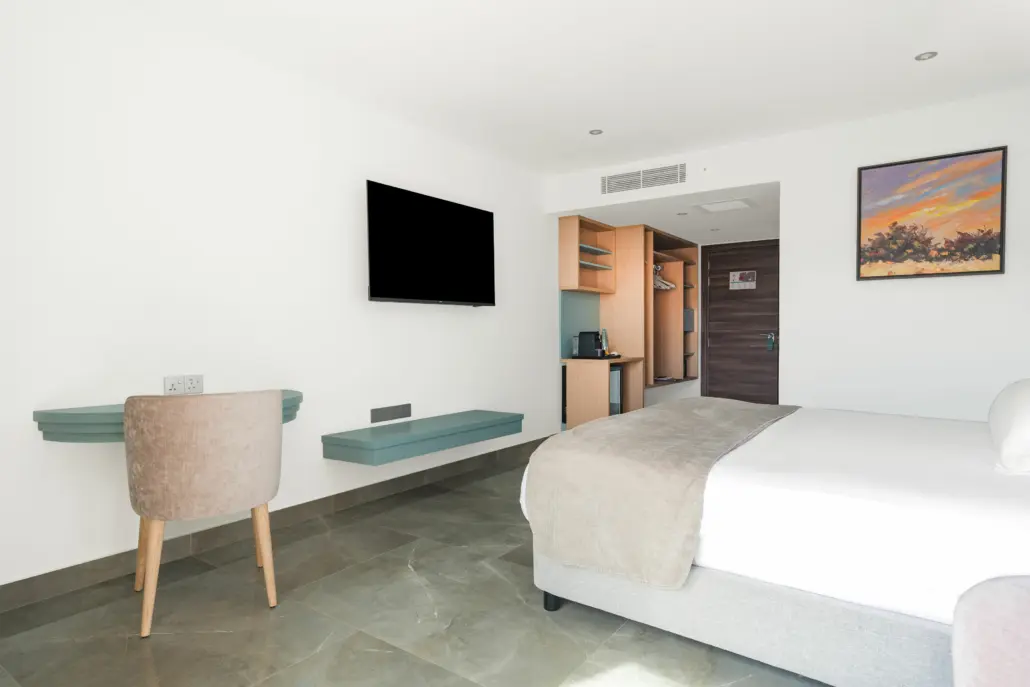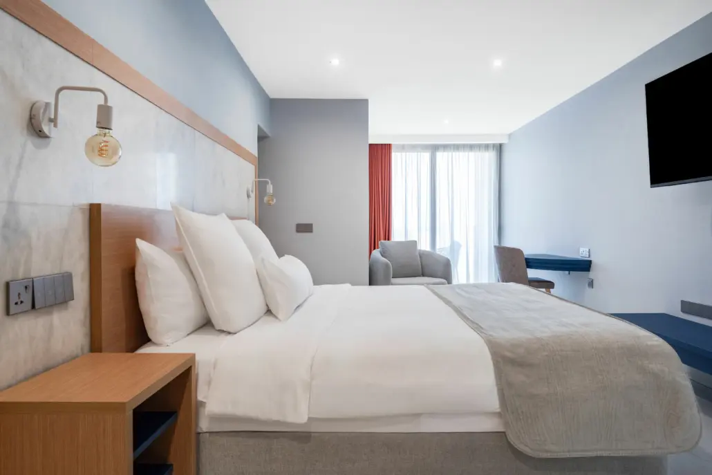 Unwind in peaceful comfort on the lower floors with a side-street view and everything needed for a restful stay. Wake up rested in a large, comfortable bed, step into a sleek walk-in shower, and ease into the day with thoughtful details at every touchpoint. A 55 inch smart TV with Netflix invites relaxed evenings, while the desk and armchair provide space to read or reconnect.